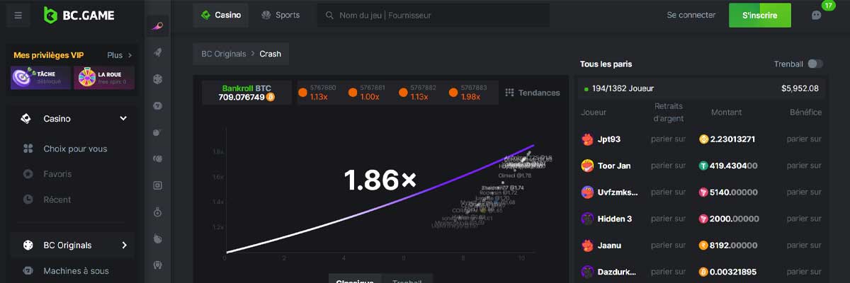 Crash est un titre de casino en ligne passionnant qui offre aux joueurs un concept unique et dynamique. L’objectif est de gagner de l’argent en encaissant le multiplicateur lorsque sa valeur augmente, ce qui se produit à des moments aléatoires. Contrairement aux autres jeux de ce genre où une machine décide de la valeur du coefficient, Crash implique une ligne qui croît jusqu’à ce qu’elle s’arrête de façon aléatoire, ce qui fait que tous les joueurs ont des récompenses ou des pertes potentielles différentes.
